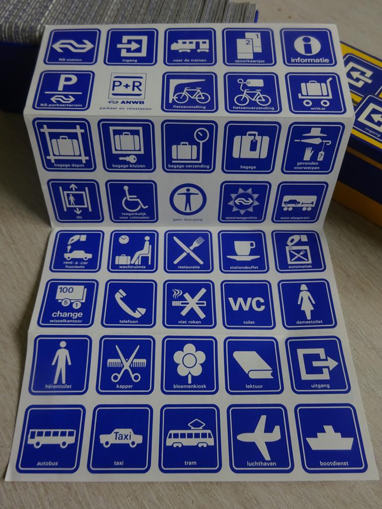 Baanbrekend design huisstijlen van europese spoorwegmaatschappijen. Nederlandse spoorwegen pictogrammen memo in woord en beeld.. Grappig ns memory met alle pictogrammen / bordjes die er op stations te vinden zijn.